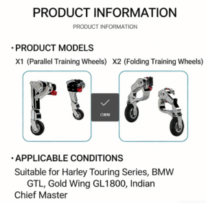 Short Description: Universal anti-tipping auxiliary wheels with auto start/stop bracket—fit Harley Road King/Street Glide, Honda Gold Wing, Indian, BMW R1250GS (Water Bird), R18. Prevent tipping, easy install, heavy-duty design.